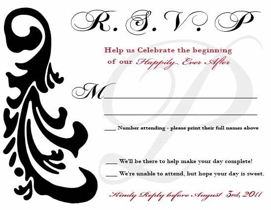 2. Fill in the blanks. It’s pretty common to see this on an RSVP card: “M_________________________”. Any idea what this is for? Your name! The “M” is for Mr., Mrs., or Ms. So, if your name isn’t already written in, just fill in the blank (ie., Mr. and Mrs. John Doe). Whatever you do, do NOT write in the name of someone to whom the invitation was not addressed. If the person wasn’t invited, don’t go inviting them yourself (unless the host states otherwise).