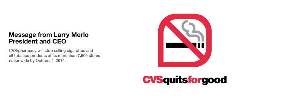 CVS Quits for GoodCVS Caremark announced today that they will stop selling cigarettes and other tobacco products in their stores beginning October 1, 2014. That’s tremendous! As stated by the company’s reps, CVS will be the “first national pharmacy chain to take this step in support of the health and well-being of its patients and customers.” Their president and CEO, Larry Merlo, said, “Ending the sale of cigarettes and tobacco products at CVS/pharmacy is the right thing for us to do for our customers and our company to help people on their path to better health. Put simply, the sale of tobacco products is inconsistent with our purpose.”